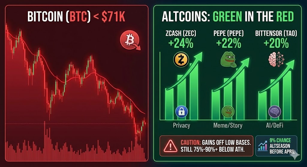 While Bitcoin has been sitting below $71,000 since February 6, some altcoins have been quietly putting up numbers. Over the past week, Zcash gained about 24%, Pepe jumped roughly 22%, and Bittensor climbed close to 20%. Traders are rotating into tokens with specific stories behind them, like privacy coins, AI-related projects, and DeFi tokens.