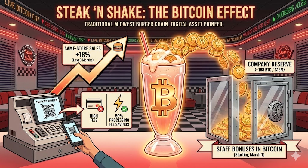 This might be my favourite story of the month. Steak ‘n Shake, the American burger chain that has been around for 90 years, announced that same-store sales have risen 18% since they started accepting Bitcoin payments through the Lightning Network nine months ago. They save about 50% on processing fees compared to credit cards. Every Bitcoin payment goes into a company reserve, which funds staff bonuses in Bitcoin starting March 1. The company now holds about 168 Bitcoin, worth roughly $15 million.