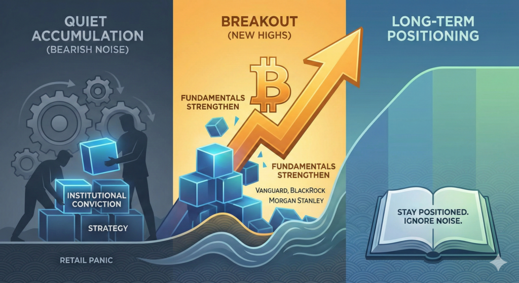 This shows long-term confidence, not short-term trading. When a company turns over $1 billion of stock into Bitcoin during a calm market, it signals that it expects much higher prices years from now, not just weeks from now.